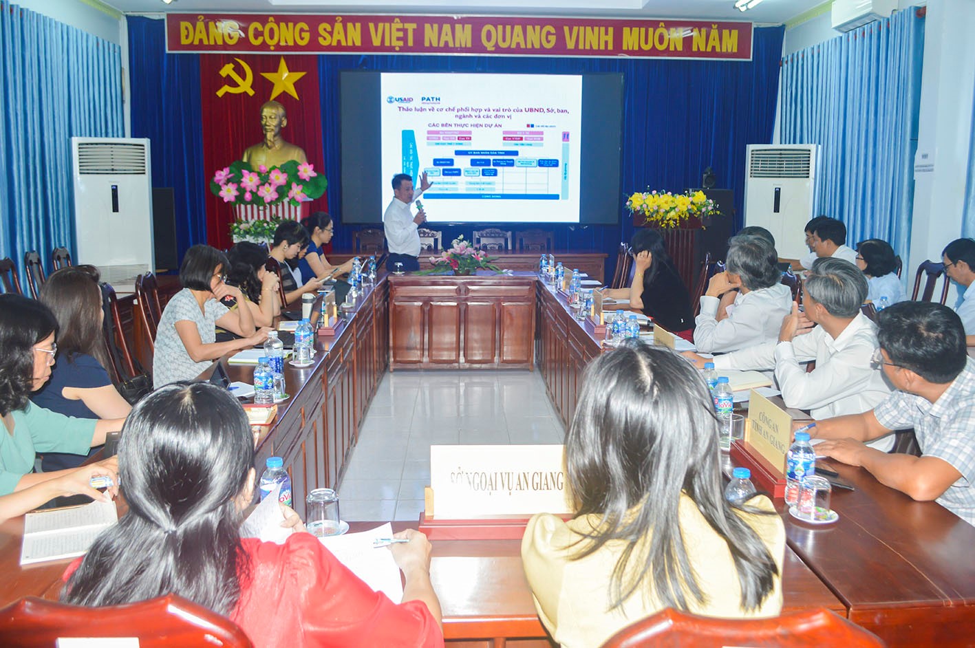 Sáng ngày 5/11/2024, lãnh đạo Sở Y tế An Giang, Sở Thông tin và Truyền thông, Sở Nông nghiệp & Phát triển Nông nông cùng nhiều sở ban ngành khác đã có buổi làm việc với Cơ quan Phát triển Quốc tế Hoa Kỳ (USAID) và Tổ chức PATH về hoạt động Dự án USAID tăng cường năng lực địa phương trong dự phòng, giám sát và đáp ứng dịch bệnh tại Sở Y tế An Giang. BS.CKII Phan Vân Điền Phương – Phó Giám đốc Sở Y tế An Giang đã đến tham dự và chủ trì cuộc họp.
