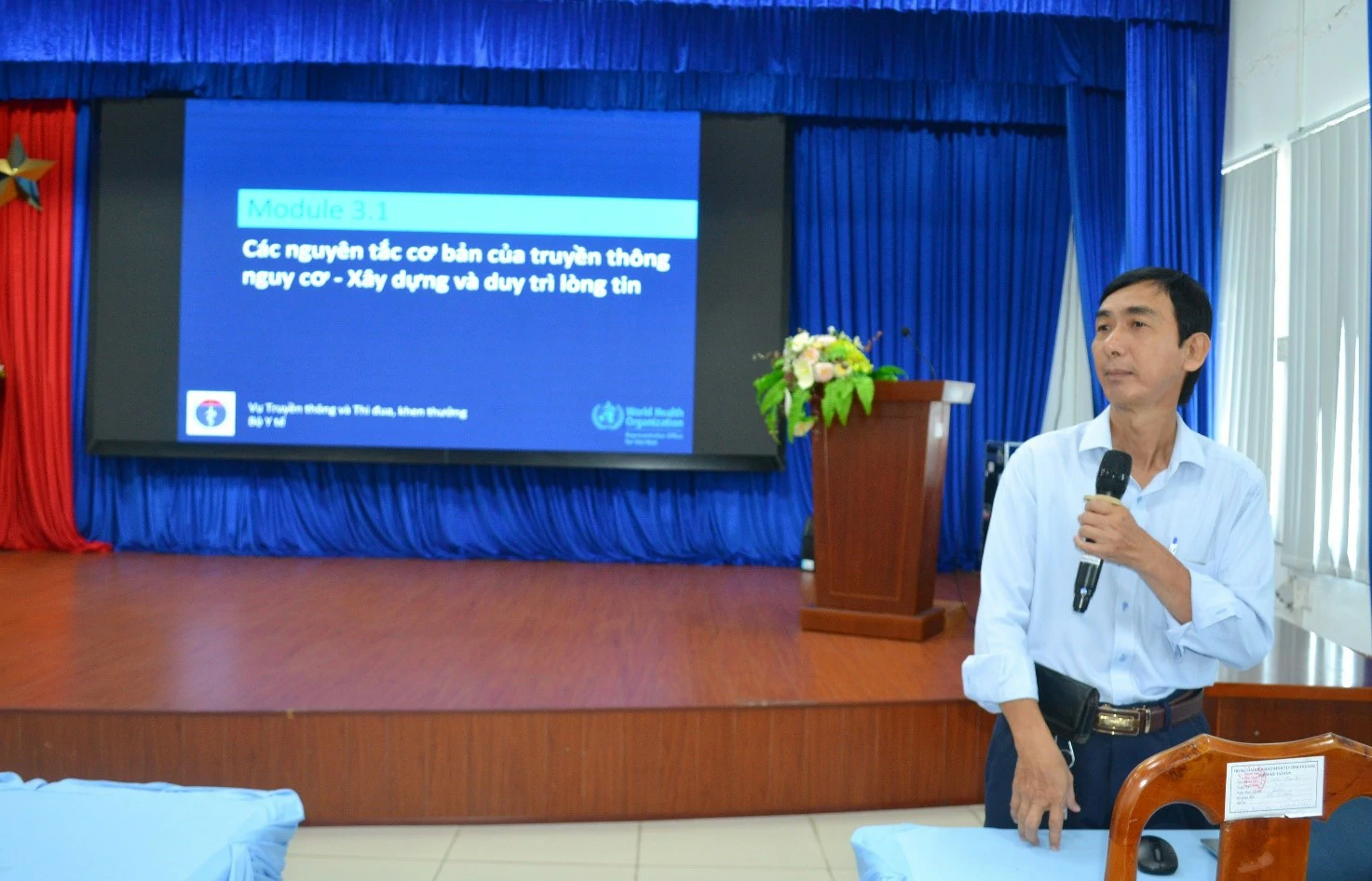 Tại lớp tập huấn, Bs.CKI Văn Hiển Tài đã chia sẻ các nội dung về truyền thông nguy cơ bao gồm: Các nguyên tắc cơ bản của truyền thông nguy cơ, Nhận thức nguy cơ, Đánh giá nguy cơ và chiến lược truyền thông nguy cơ; Ks. Tống Minh Hải chia sẻ nội dung chuyển văn bản thành giọng nói, sử dụng ứng dụng Canva để thiết kế tài liệu truyền thông./.