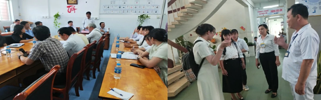 Thực hiện đánh giá giám sát tình hình nhiễm khuẩn tại TTYT, tiến hành theo dõi tình hình vi khuẩn kháng thuốc và các báo cáo theo quy định, công tác xây dựng 5 chỉ số tuân thủ quy trình kỹ thuật về kiểm soát nhiễm khuẩn; Điều trị vàng da sơ sinh bằng phương pháp chiếu đèn; tháo lồng bằng hơi; cắt túi mật, cắt tuyến giáp; Rút các dụng cụ: nẹp, vít, đinh sau phẫu thuật; Dẫn lưu màng phổi và đặt ống dẫn lưu màng phổi bằng máy hút áp lực âm liên tục; phẫu thuật cắt u buồng trứng, phần phụ u buồng trứng và mở bụng bóc u xơ tử cung; Thiết lập, hoạt động hiệu quả hệ thống điều dưỡng và hoạt động cải tiến chất lượng. Sau đó, Đoàn phân công các thành viên khảo sát thực tế tại các khoa, phòng TTYT.