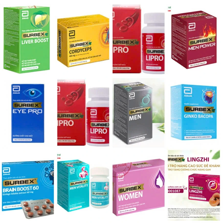 Danh sách chi tiết 14 sản phẩm bị thu hồi hiệu lực Giấy xác nhận nội dung quảng cáo kèm theo văn bản của Cục An toàn thực phẩm, bao gồm các sản phẩm mang nhãn hiệu SURBEX® như sau: