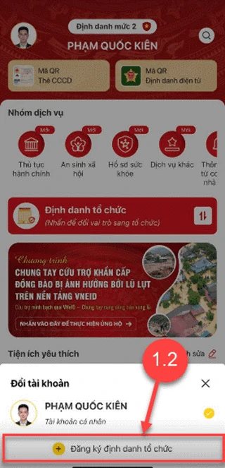 Tại màn hình Đổi tài khoản => Chọn Đăng ký định danh tổ chức