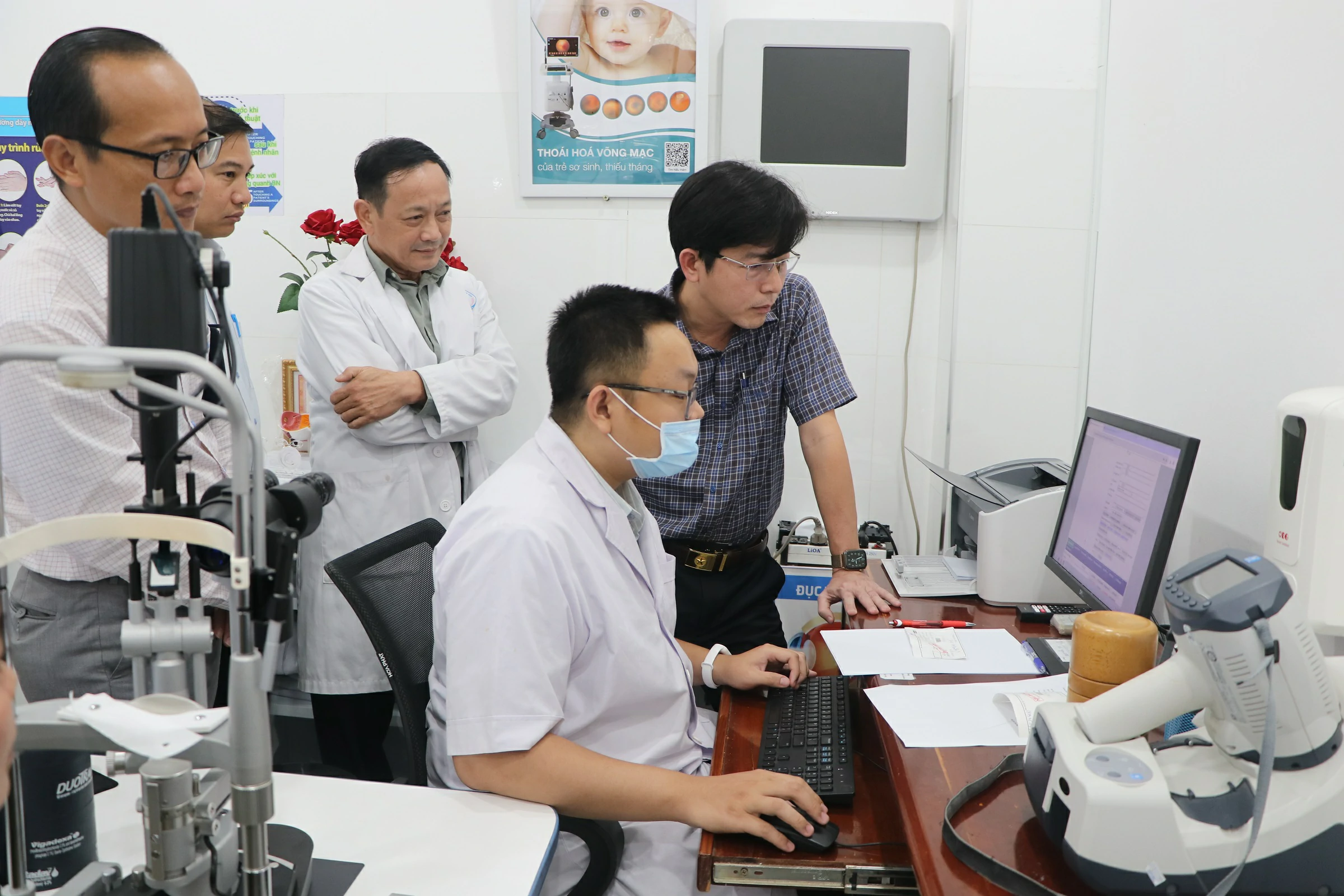 Thành viên Hội đồng kiểm tra trực tiếp khảo sát hạ tầng công nghệ thông tin, việc ứng dụng công nghệ thông tin trong quản lý điều hành hoạt động khám, chữa bệnh tại Bệnh viện mắt Nguyễn Hùng, phường Rạch Giá.