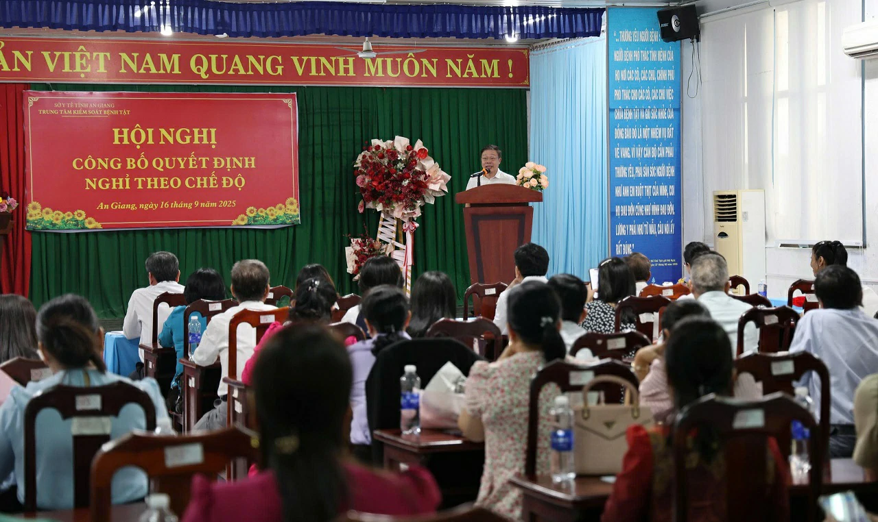 Chiều ngày 16/9/2025, Trung tâm Kiểm soát bệnh tật (KSBT) tỉnh An Giang tổ chức Hội nghị công bố quyết định nghỉ hưu trước tuổi theo Nghị định số 178/2024/NĐ-CP và Nghị định số 67/2025/NĐ-CP của Chính phủ cho viên chức của đơn vị.