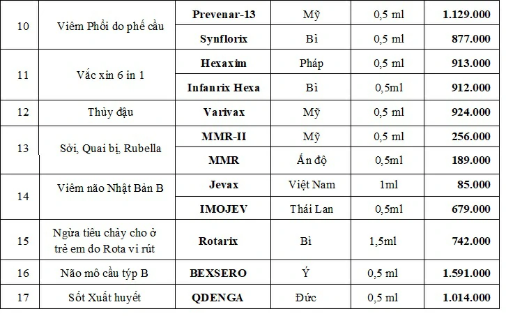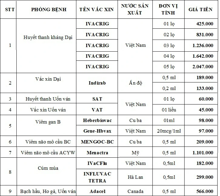 Trung tâm Kiểm soát bệnh tật tỉnh An Giang xây dựng bảng giá tiêm ngừa vắc xin dịch vụ tại đơn vị hiện có như sau: