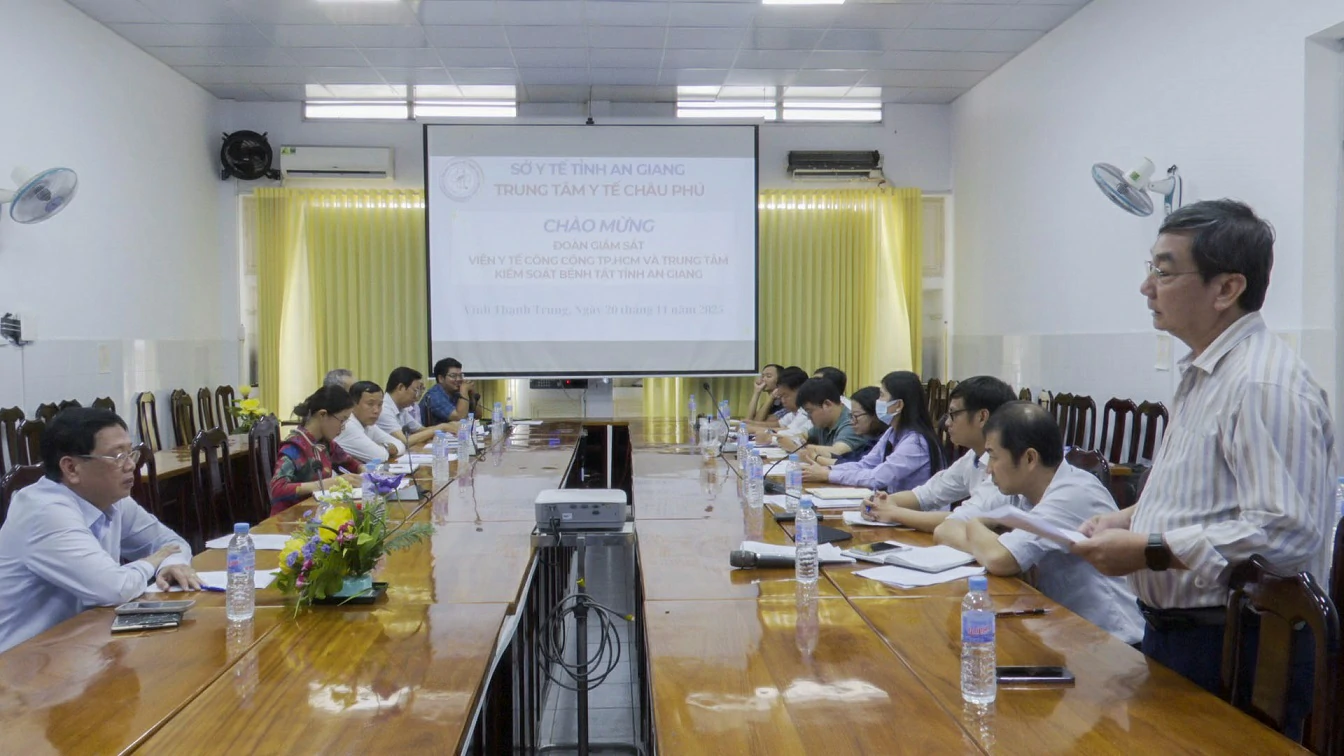 Từ ngày 19 – 20/11/2025, Viện Y tế công cộng TP. Hồ Chí Minh phối hợp cùng Trung tâm Kiểm soát bệnh tật tỉnh An Giang tổ chức đoàn giám sát hoạt động phòng, chống sốt xuất huyết Dengue tại Trung tâm Y tế An Phú và Trung tâm Y tế Châu Phú. Đoàn giám sát Thạc sĩ Tạ Quốc Đạt – Trưởng Khoa Dịch tễ – Nâng cao sức khỏe, Viện Y tế Công cộng Tp Hồ Chí Minh làm trưởng đoàn; cùng tham gia có lãnh đạo Bs.CKII Phạm Quang Quốc Uy – Phó Giám đốc Trung tâm Kiểm soát bệnh tật tỉnh An Giang, các khoa chuyên môn. Tiếp đoàn có lãnh đạo Trung tâm Y tế An Phú, Châu Phú và Trạm Y tế, Phòng Văn Hóa – Xã hội, UBND các xã Phước Hưng, xã Mỹ Đức.