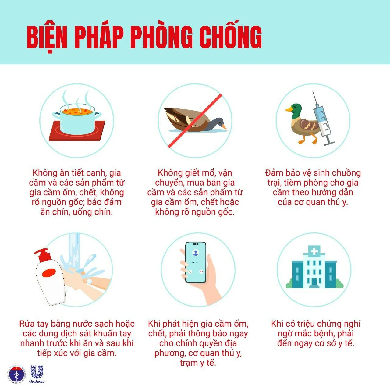 Để phòng bệnh, ngành y tế khuyến cáo người dân tuyệt đối không ăn tiết canh, không sử dụng gia cầm ốm, chết hoặc không rõ nguồn gốc; luôn đảm bảo ăn chín, uống chín. Gia cầm cần được tiêm phòng đầy đủ, chuồng trại phải giữ vệ sinh theo hướng dẫn của cơ quan thú y. Sau khi tiếp xúc với gia cầm, cần rửa tay bằng nước sạch hoặc xà phòng diệt khuẩn. Nếu phát hiện gia cầm bất thường, cần báo ngay cho chính quyền địa phương hoặc cơ quan thú y để xử lý kịp thời. Khi có dấu hiệu nghi ngờ cúm gia cầm, người dân phải đến ngay cơ sở y tế để được thăm khám và điều trị.