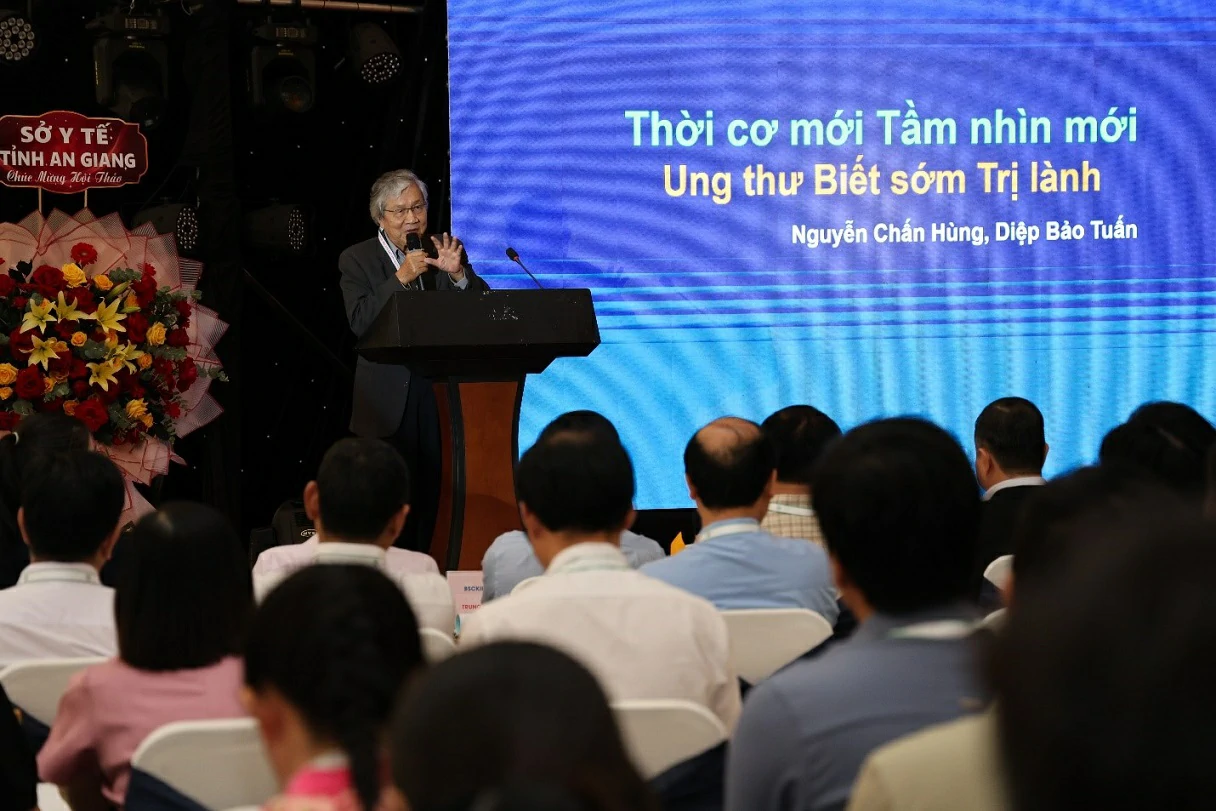 Phát biểu chỉ đạo tại hội thảo, PGS.TS.BS Trần Quang Hiền – Giám đốc Sở Y tế An Giang nhấn mạnh: sau khi sáp nhập tỉnh, quy mô dân số đông, địa bàn rộng, công tác chăm sóc và bảo vệ sức khỏe nhân dân tiếp tục là nhiệm vụ trọng tâm của ngành y tế. Hội thảo Phòng, chống Ung thư được tổ chức trong bối cảnh cả nước chuẩn bị Đại hội Đảng lần thứ XIV, trong đó Nghị quyết số 72 xác định rõ tư duy chuyển từ “chữa bệnh” sang “chăm sóc sức khỏe toàn diện”, lấy phòng bệnh làm phương thức chính. Hội thảo lần này thể hiện đúng tinh thần của Nghị quyết, đồng thời cho thấy sự quan tâm, đầu tư của Tỉnh ủy, UBND tỉnh và ngành y tế đối với chiến lược phòng, chống ung thư, đặc biệt là đầu tư trang thiết bị và nâng cao chất lượng chuyên môn.