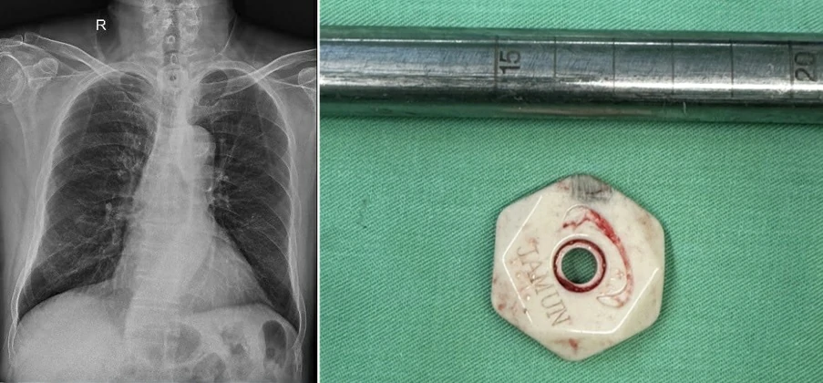 Hình ảnh dị vật cản quang trên phim Xquang ngực thẳng và dị vật sau khi được lấy ra khỏi cơ thể bệnh nhân.