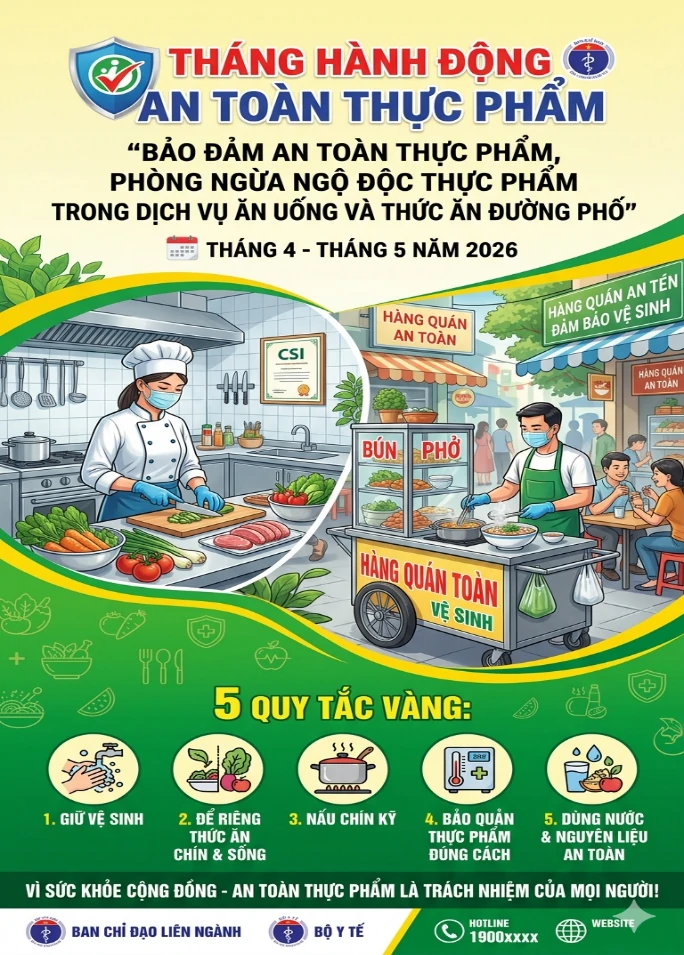 Hằng năm, Tháng hành động vì an toàn thực phẩm từ ngày 15/4 đến 15/5 diễn ra trên phạm vi toàn quốc được tổ chức nhằm nâng cao nhận thức và trách nhiệm của các cấp, các ngành và toàn xã hội trong việc bảo đảm an toàn thực phẩm. Năm nay, với chủ đề “Bảo đảm an toàn thực phẩm, phòng ngừa ngộ độc thực phẩm trong dịch vụ ăn uống và thức ăn đường phố”, thông điệp được nhấn mạnh là kiểm soát chặt chẽ các nguy cơ gây mất an toàn thực phẩm, đặc biệt tại các cơ sở kinh doanh ăn uống và thức ăn đường phố – nơi tiềm ẩn nhiều rủi ro ảnh hưởng trực tiếp đến sức khỏe cộng đồng.